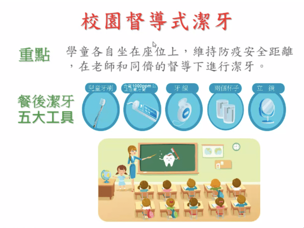 新型冠狀病毒(covid19)疫情之下,建議推廣校園督導式潔牙,學童在座位上潔牙時不僅能保持安全距離,也能讓孩子確實做好口腔清潔。