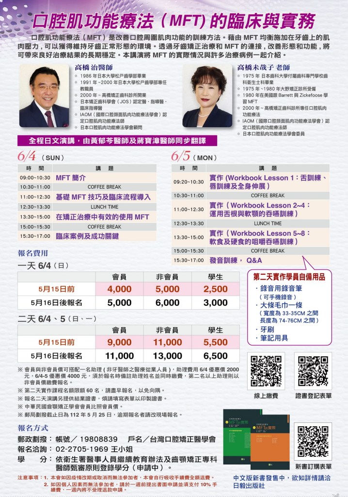 這次研討會主題是「口腔肌功能療法(MFT)」是改善口腔周圍肌肉功能的訓練方法,是一種以咀嚼、吞嚥、發音、放鬆時的舌頭位置與口唇的位置、呼吸等口腔機能的改善為目標,訓練舌頭與口腔顏面肌肉的活動的療法。 最終目標是「口腔功能的提升」「口腔功能的正常活動」、「回復正確的口腔功能」等「QOL(生活品質的恴改善」與「ADL(日常生活活動)的提升」。演講邀請到當今日本火紅的高橋醫師夫妻檔。演講搭配上實作,想必來參加的學員都可以收穫滿滿地回家!