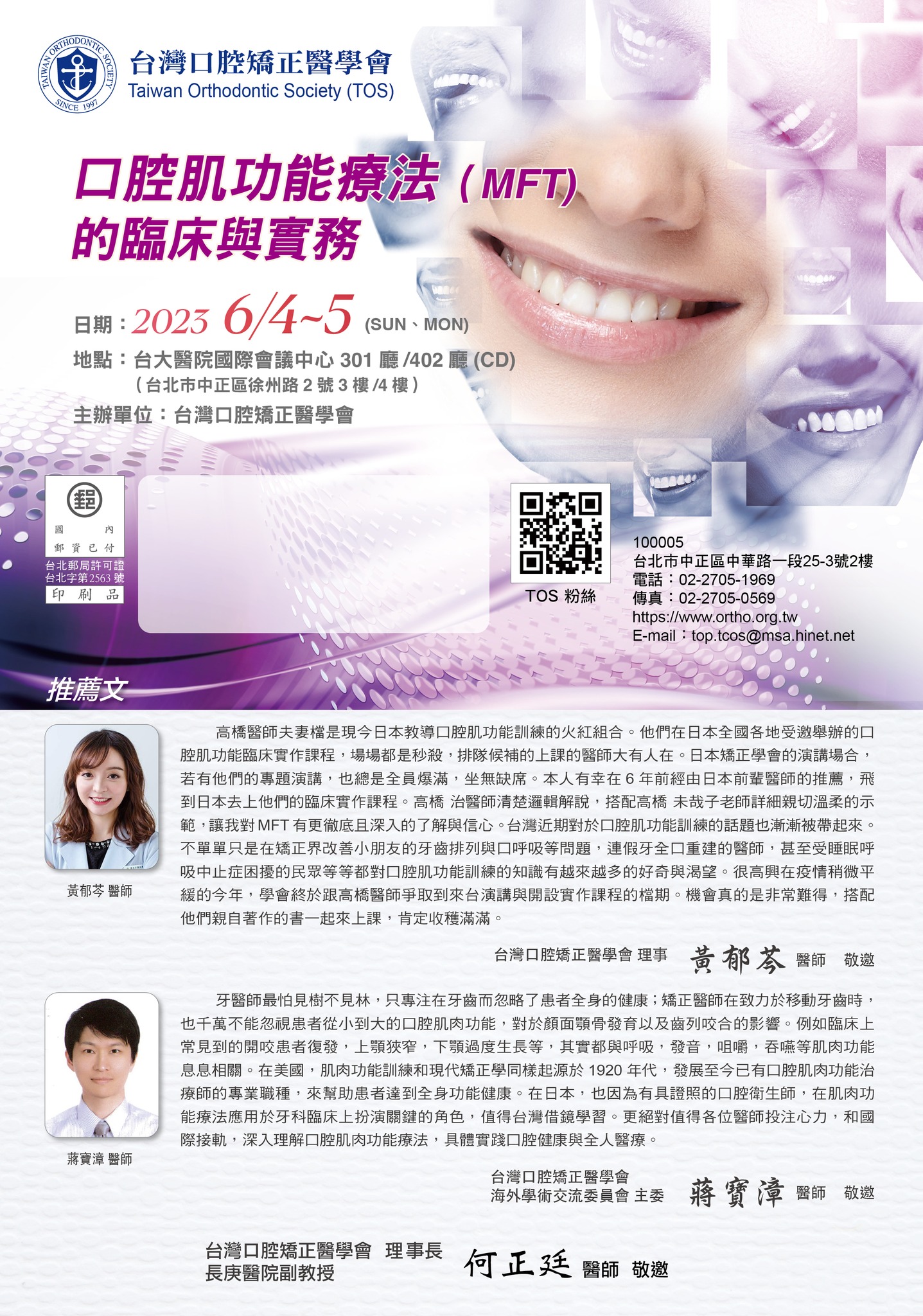 這次研討會主題是「口腔肌功能療法(MFT)」是改善口腔周圍肌肉功能的訓練方法,是一種以咀嚼、吞嚥、發音、放鬆時的舌頭位置與口唇的位置、呼吸等口腔機能的改善為目標,訓練舌頭與口腔顏面肌肉的活動的療法。 最終目標是「口腔功能的提升」「口腔功能的正常活動」、「回復正確的口腔功能」等「QOL(生活品質的恴改善」與「ADL(日常生活活動)的提升」。演講邀請到當今日本火紅的高橋醫師夫妻檔。演講搭配上實作,想必來參加的學員都可以收穫滿滿地回家!