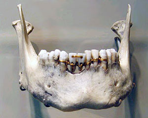 這些線被綁在牙齒上,迫使牙齒移動並關閉明顯的縫隙。雖然沒有記錄日期,但這個牙齒裝置很可能發生在我們這個時代開始之前。